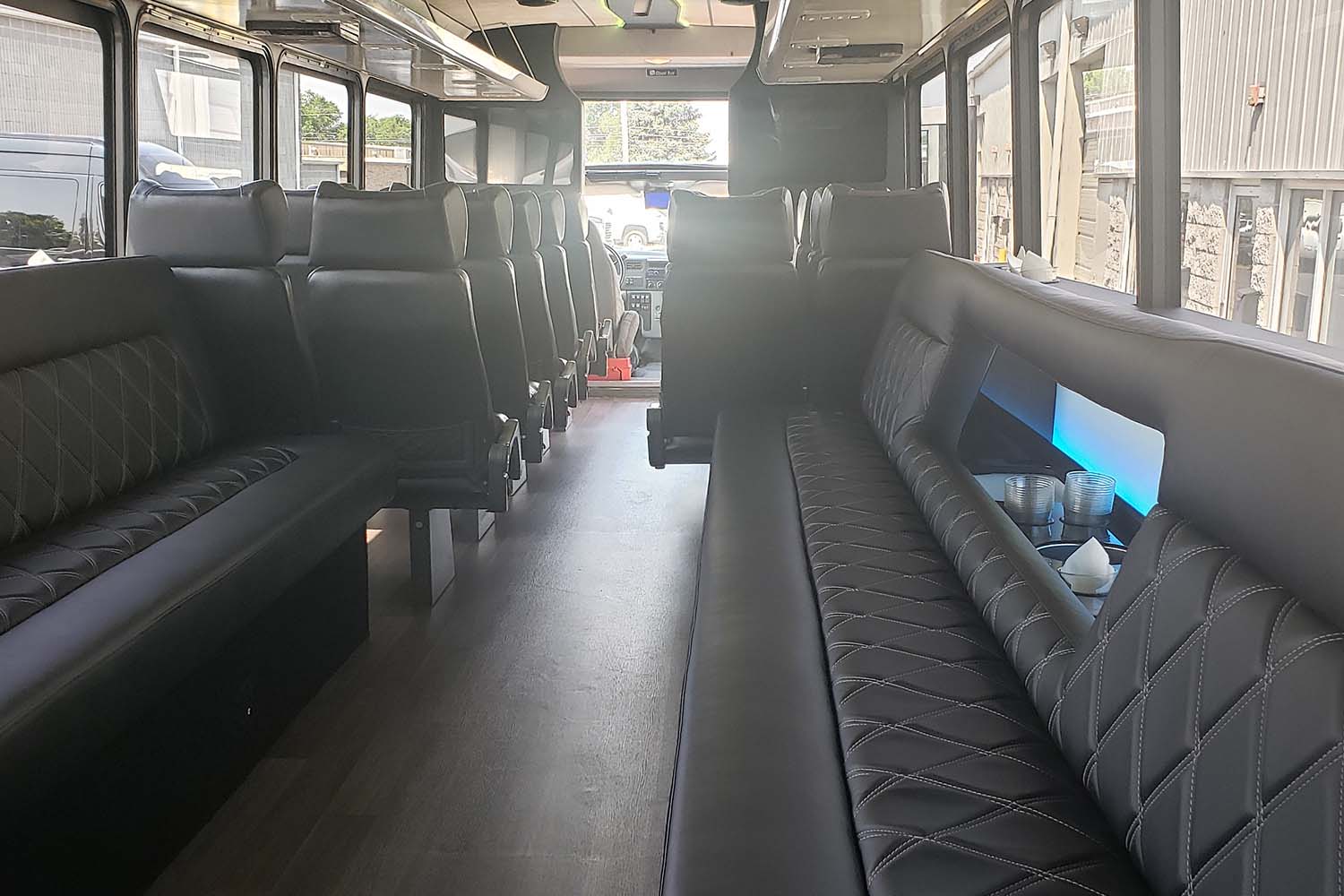 Our hybrid coach bus that offers both forward and wrap around seating! Built-in coolers and champagne buckets. Overhead storage, LED and fiber optic lights and a sound system that is top of the line.
