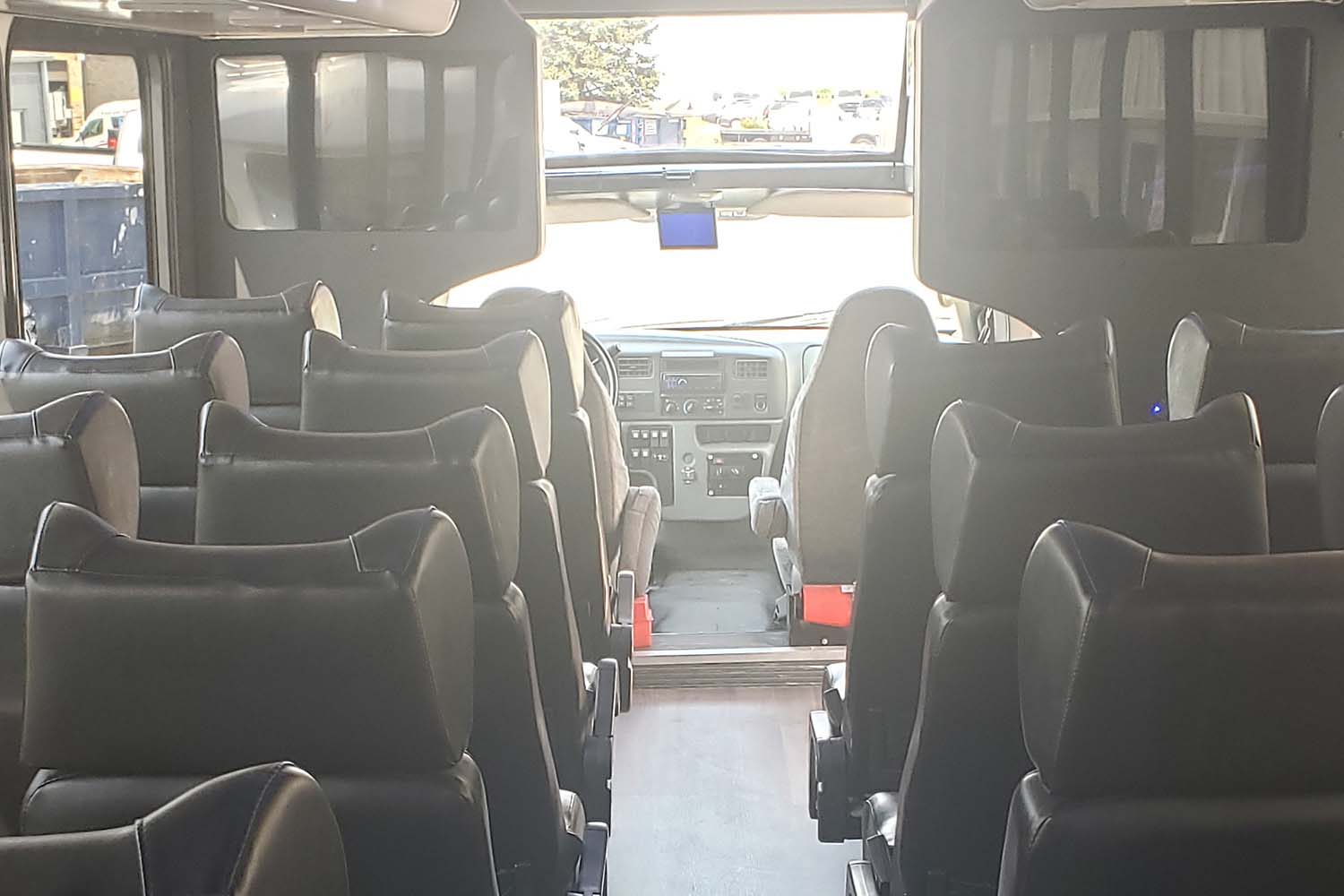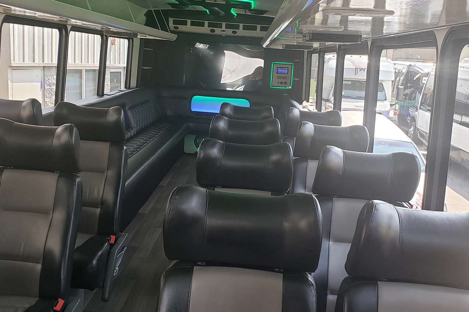 Our hybrid coach bus that offers both forward and wrap around seating! Built-in coolers and champagne buckets. Overhead storage, LED and fiber optic lights and a sound system that is top of the line.